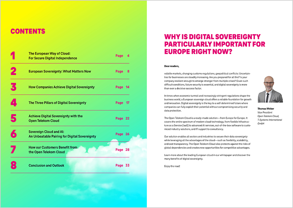 Find out in the new Open Telekom Cloud white paper why Europe’s digital independence is becoming increasingly important and what role sovereign cloud solutions play in this context. The white paper provides solid data on companies’ needs and requirements, highlights key success factors such as open standards and data protection, and shows how the Open Telekom Cloud creates tangible value—from industry solutions to AI applications. Benefit from practical insights, up-to-date market data, and customer examples. Download it now for free and learn more about the “European Way of Cloud”!